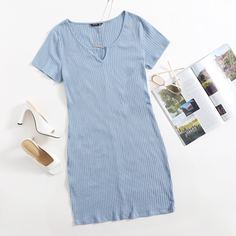 Пыльно-синий Повседневный Короткий рукав Хлопок Одноцветный Облегающий Легкий Эластичный Лето Платья размер плюс, size features are:Bust: ,Length: Короткое ,Sleeve Length:Короткий рукав