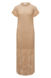Бежевое сетчатое миди-платье не сковывает движения и почти не ощущается на теле. Однотонная вязаная модель с круглой горловиной, короткими рукавами и разрезами по бокам выполнена из тонкой хлопковой пряжи. Наши стилисты предлагают создать образ с сумкой...