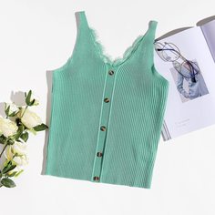 Бирюзовый Повседневный Без рукавов Вискоза Одноцветный Легкий Эластичный Весна Трикотажные топы, size features are:Bust: ,Length: Короткий ,Sleeve Length:Без рукавов
