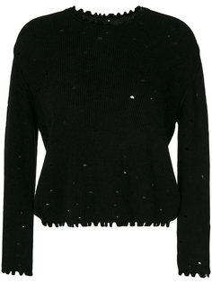 Свободный кашемировый топ выглядит состаренным за счет спущенных петель и бахромы на ребристых широком поясе и горловине. Сзади модель украшена крупным брендированным патчем, похожим на бирку. Состав: Кашемир: 100%;