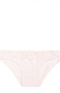 Комплект, состоящий из трех классических хлопковых трусиков бикини с контрастным принтом в горох и яркой отделкой.