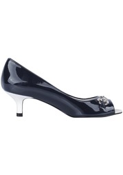 Супермодные туфли достойны завершить самый стильный вечерний look. Модель с тиснением "кожа рептилии", легким блеском и контрастным мыском с заклепками. Женственный филигранный каблук около 7 см (для размера 37). Открытая пятка с пряжкой на тонком ремеш...