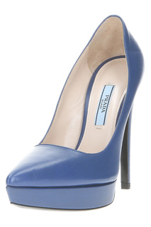 Синие кожаные туфли-лодочки от Prada. Низкий каблук, заостренный носок, бирка с логотипом.