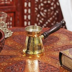 Турка с крышкой "Золотые узоры" латунь 250 мл. Не представляете своего утра без чашечки горячего и ароматного свежесваренного кофе? Тогда вам не обойтись без удобной и надежной турки, позволяющей превратить процедуру варки напитка в подлинный ...