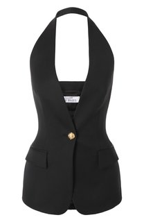 Жилет с широкими лацканами и вырезом халтер сшили из костюмной ткани на основе вискозы с добавлением шерсти. Модель с регулируемым ремешком на открытой спине дополнили прорезными боковыми карманами. Состав: Вискоза: 79%; Шерсть: 21%;