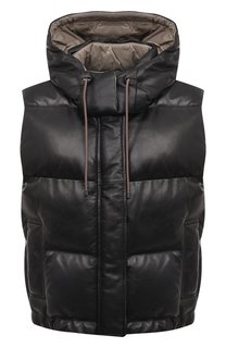 Черный жилет с глубоким съемным капюшоном и высоким воротником мастера марки, основанной Брунелло Кучинелли, сшили не из привычного для таких вещей текстиля, а из мягкой гладкой кожи. За поддержание комфортного микроклимата отвечает утеплитель из отборн...