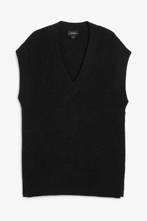 Трикотажный жилет с V-образным вырезом и отделкой в рубчик.Стандартный кройОтделка в рубчикV-образный вырезMonki cares: сделано из органического хлопкаОбхват груди для размера S — 80 см, длина — 50 см.