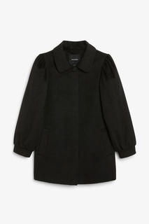Длинное пальто с объемными рукавами, закругленным воротником, 2 боковыми карманами и застежкой на 2 потайные пуговицы.Классический кройОбъемные рукаваОбхват груди для размера S — 102 см, длина — 77 см.
