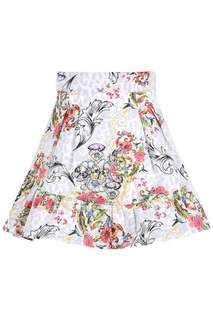 Модель выполнена из принтованного хлопка со складками на тонкой хлопковой подкладке с притачной контрастной сеткой по низу. Притачной пояс из резинки. Металическая молния сзади. Пришивное лого на поясе.