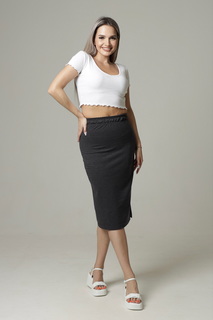 Однотонная расцветка, завышенная талия, юбка-карандаш, длина миди и шлица по центру сзади.