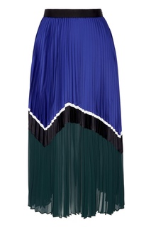 Юбка-миди из плиссированной ткани синего и темно-зеленого цвета украшена фигурной контрастной полосой. Расклешенная модель с высокой посадкой дополнена черным пришивным поясом и скрытой застежкой на молнию. Состав: 100% полиэстер