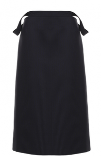 Темно-синяя юбка-карандаш из гладкой шерсти в тонкую полоску дополнена узкими лентами, похожими на лямки комбинезона. Модель была представлена на показе весенне-летней коллекции марки, основанной Кристобалем Баленсиагой, в комплекте с голубой рубашкой, ...