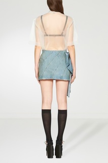 Мини-юбка из голубого денима с винтажным эффектом. Дизайн имитирует перешитую из старой джинсовой куртки вещь. Сбоку — эффектный бант со складками, выполненный из той же ткани. Боковая застежка-молния. Состав: 100%ХЛОПОК