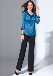 Брюки. Гладкий пояс с эластичной вставкой сзади. Карманы по бокам, декоративные вытачки. Длина брючин с внутренней стороны ок. 74 см, ширина брючин внизу ок. 15 см.