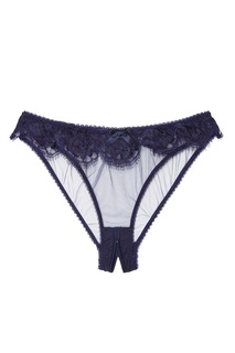 Французские трусики Piper от Agent Provocateur сшиты из полупрозрачной синей сетки. Верхний край декорирован кружевом шантильи в тон. Фасон «бриф» с овальными вырезами. Состав: 100% полиамид кружево: 39% вискоза 36% хлопок 25% полиамид