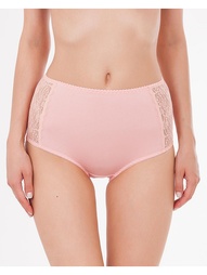 Изысканные классические трусики из хлопкового полотна с необычной кружевной вставкой. Линия талии занижена, боковые части расширены. По поясу и ножкам – эластичная тесьма. Полупрозрачное кружево на передней верхней детали добавляет шарма. Классика схара...